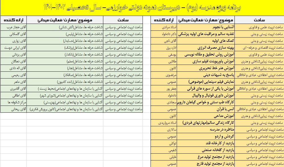 برنامه فوق را در کنار برنامه درسی در طول سال تحصیلی اجرا خواهد نمود.